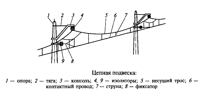 При высокой скорости движения провисание контактного провода должно быть минимальным. Это обеспечивается конструкцией цепной подвески, в которой контактный провод между опорами подвешен не свободно, как в простой подвеске, а прикреплен к несущему тросу с помощью часто расположенных проволочных струн. Благодаря этому расстояние между поверхностью головки рельса и контактным проводом остается практически постоянным. Для цепной подвески в отличие от простой требуется меньше опор: они располагаются на расстоянии 70...75 м друг от друга.