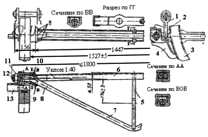 Триангель состоит из основной балки 6, изготовленной из швеллера, струны 7, имеющей круглое сечение диаметром 33 мм, со вставками 8 и скобой 9 (струну со вставками 8 сваривают встык заранее), распорки 5, имеющей прямоугольное сечение 25х60 мм с отверстием для постановки валика, крепящего вертикальный рычаг, цапфы 10, корончатой гайки 11, шплинта 12, который предохраняет гайку 11 от самоотворачивания предохранительного наконечника 13, который служит для предупреждения падения триангеля на путь в случае обрыва подвесок 1 тормозного башмака 4 с колодкой 3. Тормозная колода 3 крепится к башмаку 4 с помощью чеки 2.