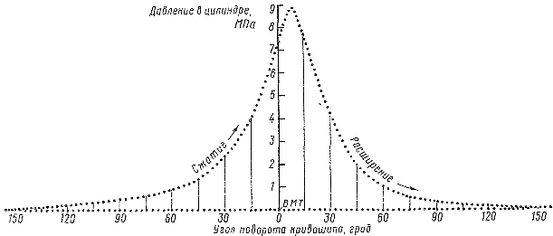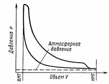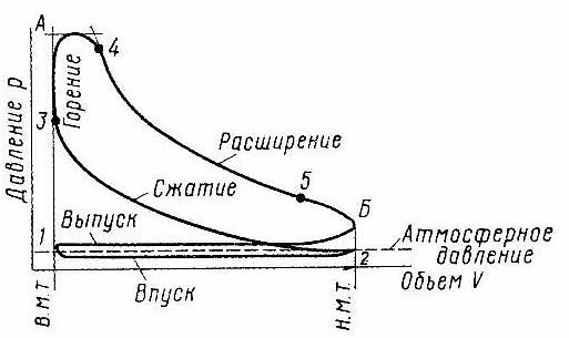 ИНДИКАТОРНАЯ ДИАГРАММАПроцессы, происходящие в цилиндрах поршневого двигателя, помимо круговой диаграммы, могут быть изображены в виде индикаторной диаграммы, названной так потому, что ее вычерчивает особый прибор — индикатор (от латинского слова — indico, что значит указываю, определяю). Индикаторная диаграмма — это графическое отображение изменения давления газа в цилиндре поршневого двигателя в зависимости от перемещения поршня или утла поворота кривошипа. Рис. 24. Развернутая индикаторная диаграмма дизеля с наддувом По этой диаграмме может быть получена (пересчетом) кривая изменения температуры газов в цилиндре в зависимости от угла поворота кривошипа. На так называемой свернутой индикаторной диаграмме (рис. 25) изменение давления дано в зависимости от положения поршня. Рис. 25. Индикаторная диаграмма дизеля без наддува Участок 3—А, выделенный на рис. 26, а, соответствует горению топлива при постоянном объеме. Такой процесс, называемый изохорным (слово «изохорный» происходят от греческих слов isos — равный, одинаковый и chora — место, пространство, занимаемое чем-нибудь), возможен только при очень быстром, почти мгновенном сгорании топлива. Однако практически в двигателе с самовоспламенением от сжатия вся порция жидкого топлива не может быть впрыснута в цилиндр мгновенно и тем более мгновенно сгореть. Рис. 26. Графическое изображение процессов горения в координатах p-V (давление - объем) Поэтому часть топлива сгорает не при постоянном объеме, а за время перемещения поршня на величину AS (рис. 26, б). В этот период постепенного (а не мгновенного!) сгорания топлива давление газов в цилиндре не повышается, а остается постоянным (изобарный процесс- слово «изобарный» происходит от isos и греческого baros, что означает вес, тяжесть), так как при перемещении поршня одновременно увеличивается объем газов в цилиндре. На рис. 26, б (справа) выделена линия А—4, изображающая горение топлива при постоянном давлении. Рабочий цикл дизеля называется циклом со смешанным сгоранием (линия 3—А—4 на рис. 25), так как на линии 5—Б имеет место изохорическое сгорание, а на линии А—4 — изобарическое. Для большей наглядности отдельные участки индикаторной диаграммы четырехтактного дизеля без наддува представлены на рис. 27. Рис. 27. Графическое изображение отдельных участков индикаторной диаграммы для дизеля без наддува и соответствующие положения поршня в цилиндре Из всех процессов, с которыми мы познакомились, только во время одного процесса А—Б (см. рис. 25) совершается полезная работа. Остальные процессы являются вспомогательными, и на их выполнение затрачивается некоторая часть полезной работы, создаваемой в соседних цилиндрах. Рис. 28. Индикаторная диаграмма двухтактного двигателя По мере развития тепловых двигателей и увеличения их быстроходности совершенствовались и индикаторные приборы. Простые по устройству механические индикаторы уступили место более сложным, которые позволяют не только получать индикаторные диаграммы отдельных процессов и судить о правильности их протекания, но даже наблюдать эти процессы непосредственно на экране (визуальные наблюдения). В начало статьи |
