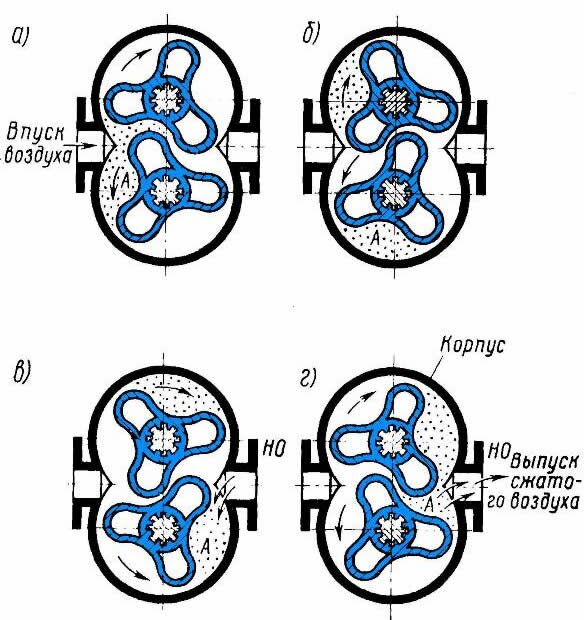 Рис. 31. Схема работы двухроторной трехлопастной воздуходувки