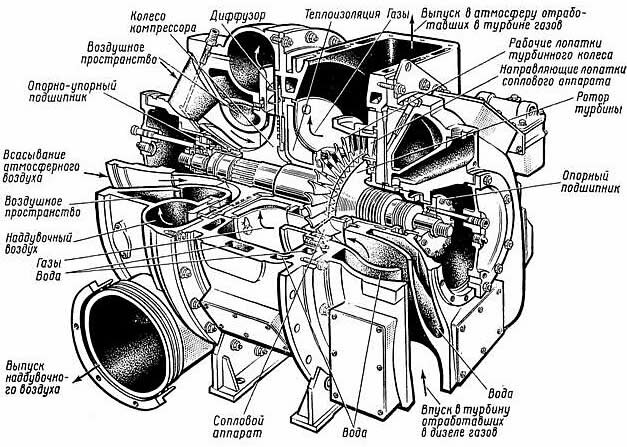 Отработавшие в дизеле газы по кольцевому впускному патрубку (см. нижнюю часть рисунка) подводятся к сопловому аппарату, в котором повышенное по сравнению со свободным выпуском давление газа преобразуется в скорость, т. е. потенциальная энергия давления преобразуется в кинетическую энергию движения газов. Неподвижные лопатки этого аппарата расположены по окружности перед рабочими лопатками турбинного колеса. Из соплового аппарата газы, имея необходимое направление, с большой скоростью поступают на рабочие лопатки колеса турбины: кинетическая энергия движения газов преобразуется в энергию вращения колеса турбины. Одновременно часть тепловой энергии выпускных газов за счет их расширения в турбинном колесе дополнительно используется для вращения ротора турбины. Газы, отработавшие в турбине, отводятся в атмосферу по выпускному патрубку. А так как на другом конце ротора турбины закреплено колесо компрессора, то, вращая турбинное колесо (с частотой до 18000 об/мин), газы заодно с ним заставляют вращаться с той же частотой и рабочее колесо компрессора. При этом на дизеле 10Д100 это колесо всасывает (через фильтр компрессора) атмосферный воздух и нагнетает его через лопаточный диффузор (расширяющийся канал) в охладитель воздуха, а оттуда во всасывающую полость приводного центробежного компрессора.