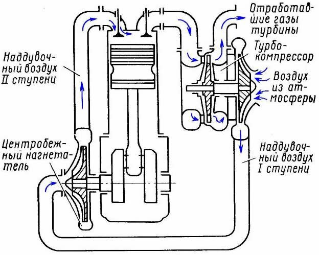 Рис. 35. Схема двухступенчатого комбинированного наддува