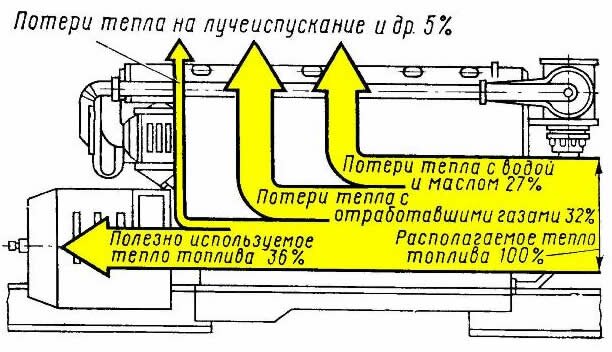 Отработавшие газы, покидая силовую установку, уносят с собой около 30 — 32% тепла, внесенного с топливом. Другой, существенной потерей является отвод тепла в воду и масло. Детали дизеля от трения и соприкосновения с горячими газами нагреваются. Чтобы детали не перегрелись и не вышли из строя, их надо непрерывно охлаждать. Потери тепла за счет охлаждения деталей водой и маслом достигают 27—30%. Кроме того, топливо в цилиндрах сгорает не полностью, имеются потери топлива в окружающую среду и т. д. Если сложить все потери, то окажется, что в рассматриваемом балансе дизеля бесполезно расходуется около 64% тепловой энергии дизельного топлива, а на полезную работу используется только 36%. Задача конструкторов и эксплуатационников — снижать потери энергии, но не в ущерб надежности дизелей.