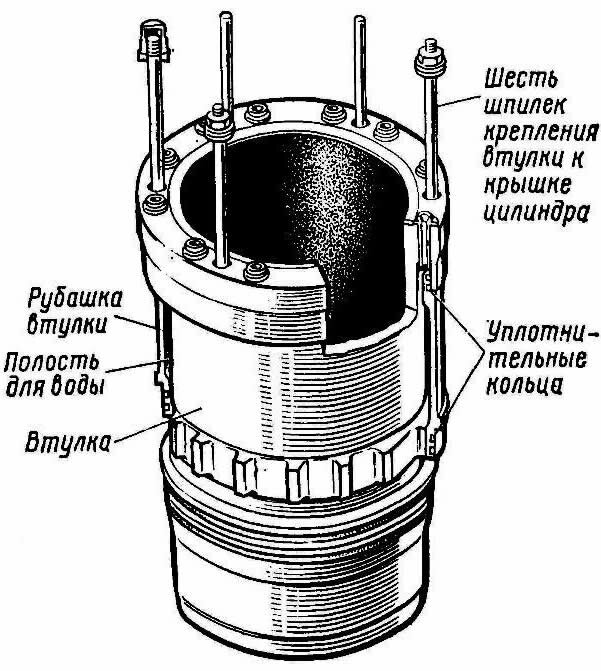 Каждая втулка дизеля типа Д100 является общей для верхнего и нижнего поршней. Нетрудно догадаться, что общая прочность втулки мало изменится, если толщину стенки ее уменьшить там, где давление газов меньше. Именно по этим соображениям втулка дизеля Д50 утолщена в верхней части, а на среднюю часть втулки. дизелей типа Д100 напрессована стальная рубашка (необходимая для охлаждения), благодаря чему прочность ее повышена. Местами уплотнения рубашки с втулкой являются специальные цилиндрические пояса, расположенные сверху и снизу от продольных ребер на внешней поверхности втулки.