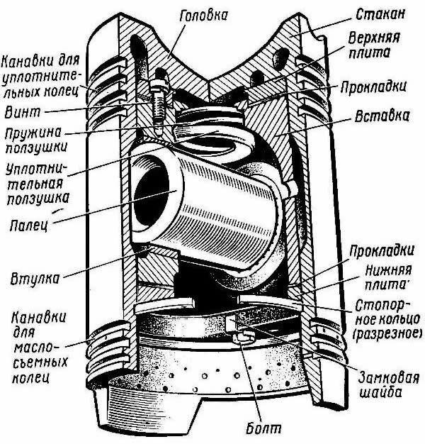 Составную конструкцию имеет и поршень двухтактного дизеля 11Д45, у которого вставка с корпусом поршня соединена также с помощью стопорного кольца.