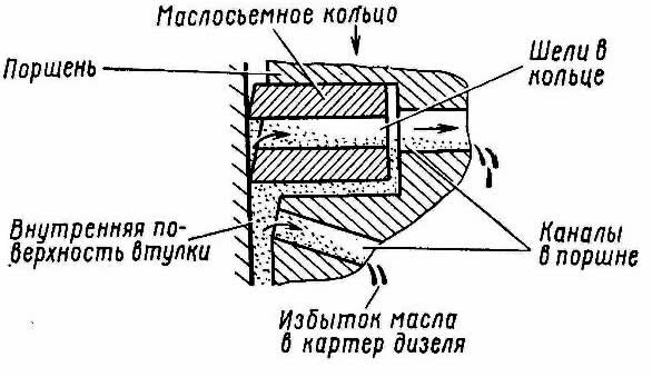Конструктивно маслосъемные кольца отличаются от уплотнительных еще и тем, что имеют скошенную острую кромку (рис. 47), которой при движении поршня вниз от камеры сгорания) они соскабливают масло со стенок цилиндровой втулки. Дальше через сквозные щели в кольце и каналы в кольцевых канавках поршня масло стекает в картер дизеля.