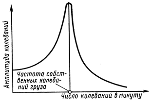 А это уже опасно, так как детали будут испытывать огромные напряжения, что может привести к их поломке. На рис. 61 представлена так называемая резонансная кривая, показывающая, как с изменением частоты возмущающей силы изменяется амплитуда колебаний, а при совпадении частоты возмущающей силы с частотой собственных колебаний груза (маховика) амплитуда вынужденных колебаний достигает максимума; при дальнейшем увеличении частоты возмущающей силы амплитуда колебаний падает.