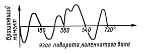 Эти силы — давление газов и силы инерции шатунно-кривошипного механизма, под переменным действием которых создается непрерывно меняющийся вращающий момент. Под влиянием неравномерного вращающего момента участки коленчатого вала деформируются: закручиваются и раскручиваются. Иными словами, в коленчатом валу возникают крутильные колебания. Сложная (рис. 62) зависимость вращающего момента от угла поворота коленчатого вала может быть представлена в виде суммы синусоидальных (гармонических) кривых с разными амплитудами и частотами. При некоторой частоте вращения коленчатого вала частота возмущающей силы, в данном случае какой-либо составляющей вращающего момента, может совпасть с частотой собственных колебаний вала, т. е. наступит явление резонанса, при котором амплитуды крутильных колебаний вала могут стать настолько велики, что вал может разрушиться. Пусть, например, частота собственных колебаний вала равна 550 колебаниям в минуту. Предположим далее, что возмущающий момент, т.е. одна из составляющих вращающего момента, начал действовать на коленчатый вал с точно такой же частотой (550 изменений в минуту). При таком совпадении частот отдельные участки вала начнут совершать резонансные крутильные колебания, очень большие по своей амплитуде.