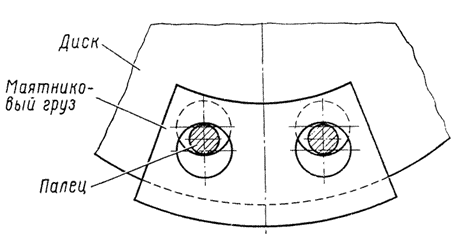 Рассмотрим конструкцию маятникового антивибратора, установленного на валу дизелей типа Д100, в котором использовано двухточечное подвешивание. Этот антивибратор настроен на устранение резонанса при четырех критических частотах вращения вала, а именно: 470, 550, 825 и 1100 об/мин. В связи с этим он имеет четыре пары секторообразных грузов (см. рис. 64), подвешенных на пальцах, опирающихся на ступицу антивибратора. Ступица жестко соединена с передним концом нижнего вала, диаметр отверстий в ступице и грузах больше диаметра пальца. Благодаря этому грузы подобно маятникам будут колебаться на своих пальцах при возникновении крутильных колебаний нижнего коленчатого вала определенной частоты, на которую они настроены.