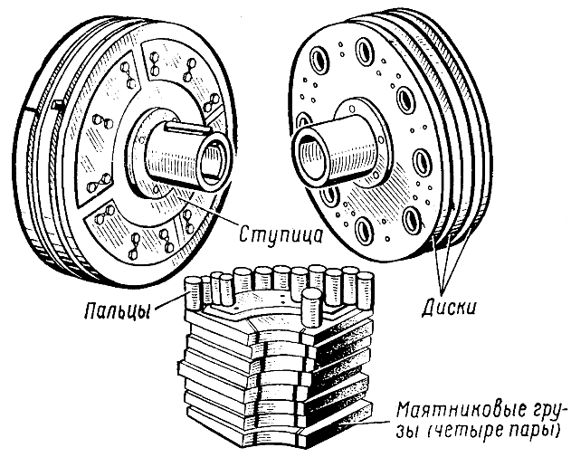 Общий вид и детали антивибратора дизеля показаны на рис. 65. Мы видим (справа) ступицу, состоящую из трех неподвижных дисков с восемью отверстиями. В эти отверстия (точнее, во втулки, запрессованные в них) вставляются (с зазорами) пальцы, на которые в свою очередь также с зазорами надеваются грузы (по четыре между каждыми двумя дисками антивибратора).