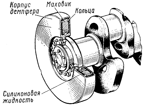 Для гашения резонансных крутильных колебаний вала в дизелях применяются также демпферы, устройство которых основано на поглощении энергии колебаний путем трения между инерционной массой и вязкой жидкостью. Такие демпферы имеют двигатели внутреннего сгорания дизельных поездов постройки Венгерской Народной Республики, которые в большом количестве эксплуатируются на железных дорогах СССР.