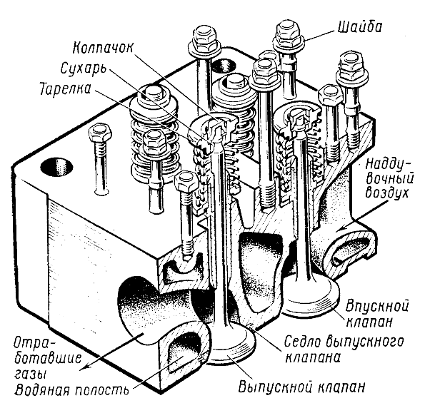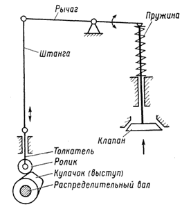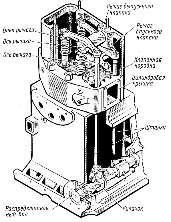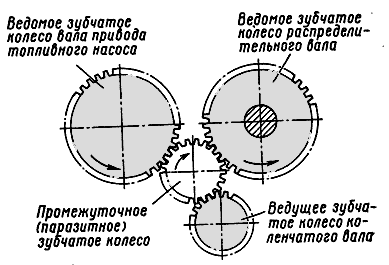 МЕХАНИЗМ ГАЗОРАСПРЕДЕЛЕНИЯОКНА И КЛАПАНЫНарушения во времени питания цилиндров дизеля воздухом или топливом, в очистке их от отработавших газов и т. п. немедленно вызовут неполное сгорание топлива и, как следствие, снижение экономичности, образование сажи (дымление), появление токсичных газов, отравляющих окружающую среду. Сажа осядет на деталях дизеля, сам дизель перегреется, мощность его уменьшится, расход топлива увеличится. Могут возникнуть и другие нежелательные явления. МЕХАНИЗМ ГАЗОРАСПРЕДЕЛЕНИЯА как заполняются цилиндры свежим воздухом? В четырехтактных дизелях (Д49, Д70, Д50, М750) это осуществляется через каналы в цилиндровой крышке, которые перекрываются впускными клапанами. В двухтактных дизелях 10Д100, 2Д100, 11Д45, 14Д40 и др. воздух в цилиндры поступает через окна в цилиндровой втулке; окна открываются и закрываются самим поршнем (на дизелях типа Д100 верхним поршнем). Механизм, который управляет движением впускных и выпускных органов и обеспечивает подачу воздуха и топлива в полном соответствии с установленным для данного дизеля порядком работы цилиндров, называется газораспределительным. Таким образом, устройство механизма газораспределения дизелей определяется тактностью дизеля, а на двухтактных дизелях — типом продувки. Рис. 67. Простейшая схема привода клапанного механизма Открытие клапанов в таких дизелях осуществляется распределительным валом, который приводится во вращение от коленчатого вала через зубчатую передачу (рис. 68). Поскольку цикл работы каждого цилиндра четырехтактного дизеля совершается за два оборота коленчатого вала, то распределительный вал вращается в два раза медленнее коленчатого. Поэтому ведомое зубчатое колесо имеет в два раза больше зубьев, чем ведущее зубчатое колесо.Как же преобразуется вращательное движение распределительного вала в поступательное движение клапанов? Деталями, с помощью которых создается движение в системе рычагов, являются кулачки. Кулачкам придают нужную форму, благодаря которой получают заданную продолжительность открытия впускного или выпускного клапана в каждом цилиндре в соответствии с диаграммой газораспределения. Поэтому профиль кулачка имеет важное значение.Чем шире выступ кулачка, тем большее время управляемый им клапан остается открытым, давая проход свежему воздуху в цилиндр или отработавшим газам из цилиндра. Рис. 68. Схема зубчатой передачи Дизели ПД1, 2Д50 и Д50 имеют шесть цилиндров, поэтому на распределительном валу размещено шесть кулачков для впускных клапанов и шесть для выпускных. Каждый кулачок должен открывать и закрывать клапаны в соответствии с порядком работы цилиндров дизеля (1-3-5-6-4-2, см. с. 80). Это достигается за счет соответствующего расположения кулачков на валу по отношению друг к другу. ОСОБЕННОСТИ МЕХАНИЗМА ГАЗОРАСПРЕДЕЛЕНИЯНачнем с того, что клапаны, открывшись, должны возвращаться в исходное положение. Для быстрого и плотного закрытия клапанов на их стержни надевают пружины. Что же мешает клапану постоянно следовать за кулачком? Ответ очень простой — силы инерции. Они стремятся на участке закрытия клапана оторвать ролик, а вместе с ним и другие детали механизма газораспределения от поверхности кулачка. В связи с этим на стержни клапанов ставят по две пружины: наружную большего диаметра и внутреннюю меньшего диаметра (р