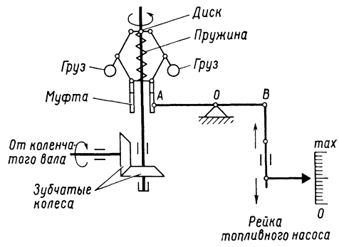 К краям диска шарнирно прикреплены два рычага с одинаковыми грузами, по одному на каждом рычаге. Грузы вращаются вместе с диском регулятора вокруг вертикальной оси и шарнирно связаны со скользящей муфтой, которая может свободно перемещаться вверх или вниз. Весь этот узел называется измерителем частоты вращения коленчатого вала дизеля. Это исходный основной орган регулятора.