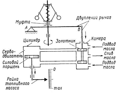 Такой простой по устройству регулятор называется центробежным регулятором прямого действия, так как он прямо (непосредственно) воздействует на рейки топливных насосов, т, е. его рычаг жестко связан с рейкой. Основной недостаток такого регулятора состоит в том, что для мощных дизелей (в 736 кВт и более) требуется большое усилие для перемещения (перестановки) реек топливных насосов. Большая сила необходима из-за того, что масса деталей, которые нужно перемещать в процессе регулирования, достигает нескольких килограммов. Кроме того, в местах сочленения рычагов, соединяющих регулятор с топливными насосами, возникают силы сопротивления от трения деталей. Поэтому приходится создавать большую центробежную силу, а для этого необходимо значительно увеличивать размеры грузов. Это делает регулятор громоздким, уменьшает его чувствительность и, как следствие, ухудшает процесс регулирования. Такие регуляторы на тепловозах не применяются.