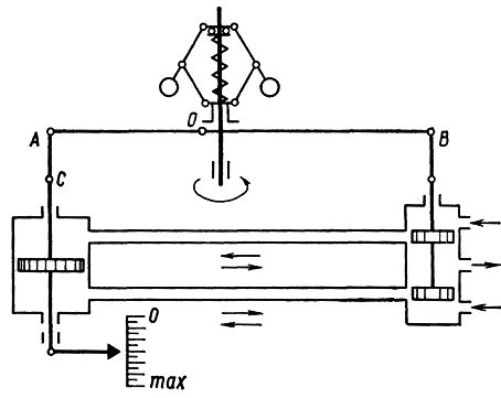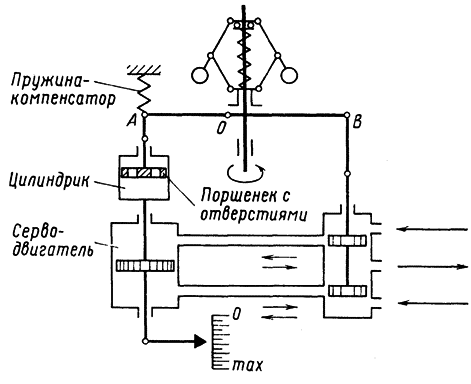 В этом случае при перемещении муфты регулятора, например, вверх точка А в начальный момент будет оставаться неподвижной потому, что поршень серводвигателя имеет сравнительно большое сопротивление движению; золотник переместится вверх и при этом откроет вход маслу в пространство под силовой поршень серводвигателя и выход масла из пространства над поршнем. Как только поршень начнет подниматься, то вместе с ним начнет подниматься и левый конец рычага АОВ (точка А), поэтому правый конец рычага (точка В), поворачивающийся около точки О муфты регулятора, станет опускаться и заставит опуститься золотник. При этом золотник будет постепенно возвращаться в среднее положение, закрывая доступ масла в пространство под поршнем. Движение поршня прекратится как раз в тот момент, когда насосы увеличат подачу топлива на величину, соответствующую увеличению нагрузки.