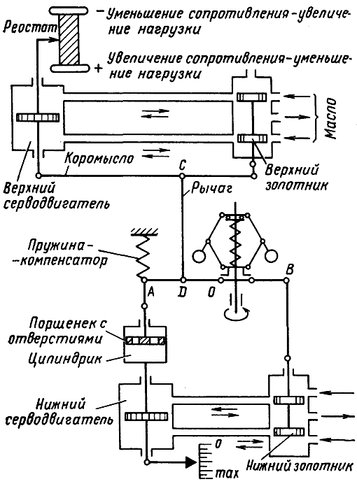 Чтобы понять принцип действия объединенного регулятора, обратимся к рис. 91. В нижней части рисунка представлена схема знакомого нам регулятора частоты вращения, в верхней части — схема регулятора нагрузки. Мы видим, что механизм управления нагрузкой соединяется с помощью жесткого рычага СД с механизмом управления частотой вращения. В регуляторе нагрузки так же, как и в регуляторе частоты, есть серводвигатель регулятора нагрузки (будем его дальше называть верхним). Он используется для изменения сопротивления реостата. Есть и золотник (условимся называть его верхним), который управляет подачей масла через каналы в силовой серводвигатель (золотник регулятора нагрузки).