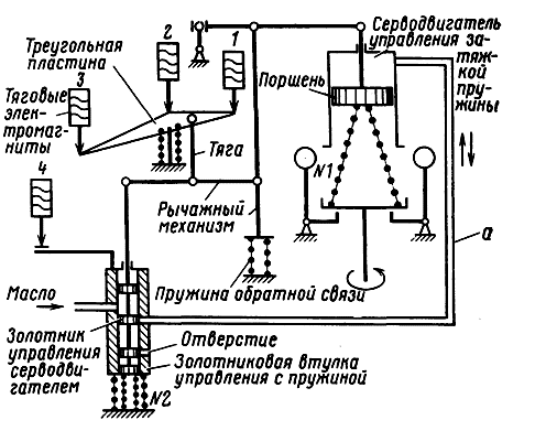 Совершенствуя свой регулятор, конструкторы Харьковского завода транспортного машиностроения заменили электропневматический механизм более чувствительным и меньшим по размерам электрогидравлическим механизмом, регулирующим затяжку всережимной пружины. Посмотрите на рис. 92. Вы видите: электрическая часть этого механизма состоит из четырех тяговых электромагнитов 1, 2, 3, 4, три из которых находятся против трех углов треугольной пластины; гидравлическая часть механизма имеет золотник управления серводвигателем, который в свою очередь управляет затяжкой пружины.