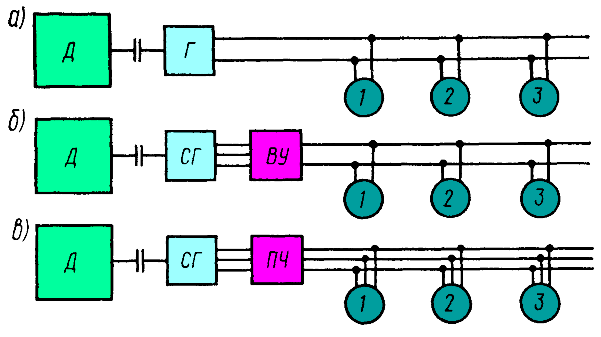 а - на постоянном; б - на переменно-постоянном; в - на переменно-переменном токе.