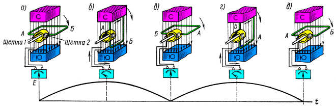 При дальнейшем вращении рамки э.д.с. в ней убывает и через четверть оборота становится равной нулю (рис. 133, в). В это время щетки переходят с одного полукольца на другое. Таким образом, за первую половину оборота рамки каждое полукольцо коллектора соприкасалось только с одной щеткой. Ток проходил по внешней цепи в одном направлении от щетки 2 к щетке 1. Будем продолжать вращать рамку. Электродвижущая сила в рамке снова начинает возрастать, так как ее рабочие стороны будут пересекать магнитные силовые линии. Однако направление э.д.с. изменяется на противоположное, потому что проводники пересекают магнитный поток в обратном направлении. Ток, индуктируемый в стороне А рамки, направлен теперь на нас. Но ввиду того, что рамка вращается вместе с коллектором, полукольцо, соединенное со стороной А рамки, соприкасается теперь не со щеткой 1, а со щеткой 2 (рис. 133, г) и по внешней цепи проходит ток того же направления, как и во время первой половины оборота. Следовательно, коллектор выпрямляет ток, т. е. обеспечивает прохождение индуктируемого тока во внешней цепи в одном направлении. К концу последней четверти оборота (рис. 133, д) рамка возвращается в первоначальное положение (см. рис. 133, а), после чего весь процесс изменения тока в цепи повторяется.