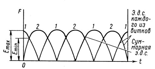 Рис. 135. Кривые пульсации электродвижущей силы двухвиткового генератора