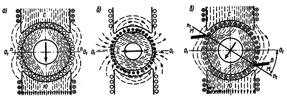 а - магнитный поток главных полюсов; б - магнитный поток, создаваемый обмоткой якоря; в - суммарный магнитный поток нагруженного генератора