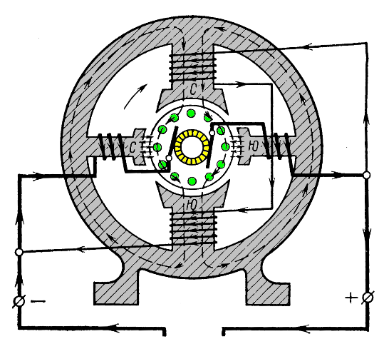 Магнитное поле якоря изменяется с изменением нагрузки (тока) генератора, поэтому для его нейтрализации необходимо изменять и поле компенсационных устройств. Обмотку добавочных полюсов включают последовательно с обмоткой якоря, и по ней проходит весь ток якоря. С увеличением тока генератора возрастает магнитный поток якоря, но вместе с этим возрастает и компенсирующий его магнитный поток добавочных полюсов.