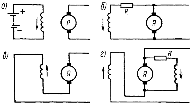 а -независимое возбуждение; б - параллельное возбуждение; в - последовательное возбуждение; г - смешанное возбуждение