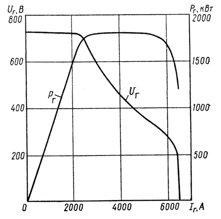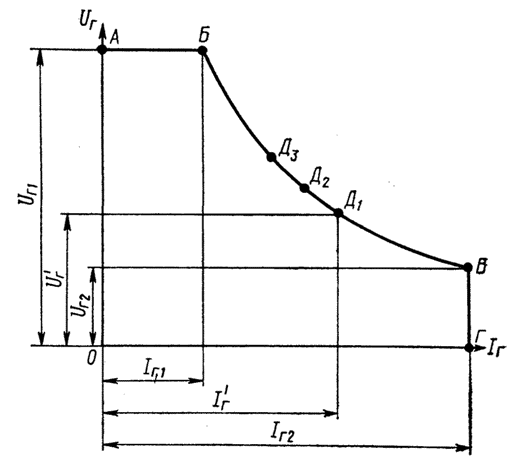 Требуемая внешняя характеристика тягового генератора может быть представлена кривой АБВГ. Основной рабочей частью характеристики является участок БВ, на котором напряжение тягового генератора изменяется обратно пропорционально току генератора и его мощность сохраняется постоянной. Эта кривая носит название гиперболы. После того как ток уменьшился до величины Iг1 (точка Б характеристики), а напряжение возросло до предельно допустимого значения Uг1, дальнейшего возрастания напряжения с уменьшением тока не происходит. Участок кривой АБ характеризует ограничение мощности генератора по напряжению. В случае когда ток достигает предельно допустимой величины, напряжение генератора начинает резко уменьшаться, предупреждая дальнейшее увеличение тока. Участок характеристики ВТ является ограничением по величине максимального тока генератора.