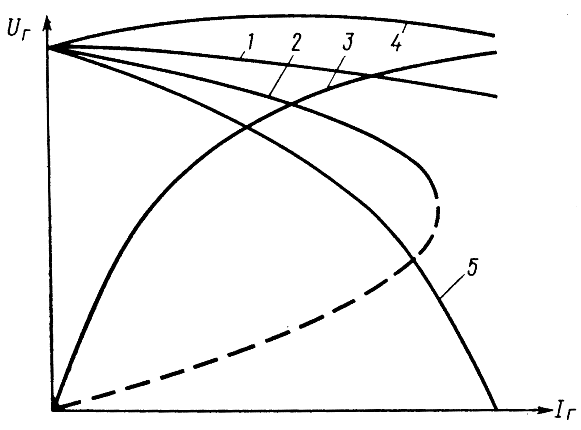 Генератор со смешанным возбуждением (кривая 4, рис. 142) в случае, если магнитные потоки обеих обмоток его возбуждения имеют одинаковые направления, может поддерживать на своих выводах напряжение близкое к постоянному. При встречном направлении магнитных потоков обмоток возбуждения напряжение генератора с увеличением тока нагрузки резко снижается за счет размагничивания последовательной обмоткой. Но его внешняя характеристика представляет собой выпуклую кривую (кривая 5, рис. 142), отличающуюся от гиперболы.