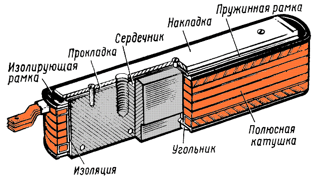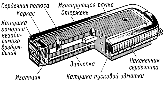 Ввиду небольших размеров сердечники добавочных полюсов выполнены цельными (сплошными). Полюсы снабжены изоляционными рамками для усиления изоляции от корпуса и пружинными рамками для предупреждения вибрации катушек на сердечниках полюсов.