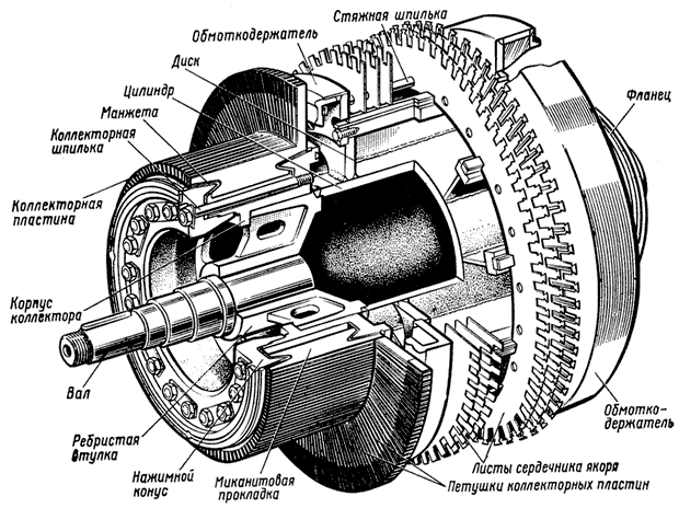 Коллектор, как уже указывалось, служит для выпрямления переменной э. д. с, индуктируемой в обмотке якоря генератора, и для съема тока. Он состоит из большого числа медных коллекторных пластин. Например, коллектор тягового генератора тепловоза 2ТЭ10Л имеет 465 пластин. При сборке коллектора между его пластинами прокладывают изоляцию из миканитовых прокладок. Миканит -— электроизоляционный материал, получаемый склеиванием тонких листочков слюды различными связующими материалами. Изоляция (миканитовые манжеты и цилиндры) прокладывается также между собранными в виде кольца коллекторными пластинами, корпусом коллектора и нажимным конусом (см. рис. 146). Основания коллекторных пластин выполнены в виде ласточкина хвоста и входят в выступы корпуса коллектора и нажимного конуса, которые стягиваются шпильками и надежно удерживают пластины. Собранный коллектор напрессовывают на ребристую втулку якоря.