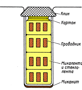 При работе генератора его якорь вращается с большой скоростью и на секции обмотки якоря действуют значительные центробежные силы. В пазах сердечника якоря секции обмотки укрепляют специальными клиньями из изоляционного материала (рис. 147).