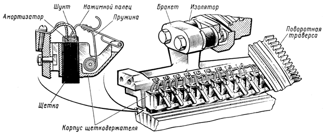 В соответствии с числом главных полюсов тяговый генератор тепловоза 2ТЭ10Л имеет десять алюминиевых бракетов, на каждом из них укреплено по девять щеткодержателей с восемнадацатью щетками. Бракеты на изоляторах крепятся к поворотной траверсе. Траверса устанавливается в подшипниковом щите генератора (см. рис. 143 и 149) и может поворачиваться для облегчения доступа при осмотре и ремонте к каждому щеткодержателю. Пять бракетов щеткодержателей одной полярности соединены шиной; одна из шин является плюсовой, вторая - минусовой.