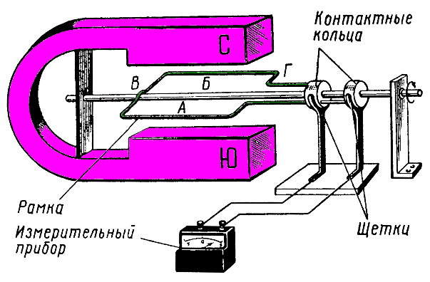 Для получения в замкнутой электрической цепи переменного тока созданы источники электрической энергии, индуктирующие переменную электродвижущую силу. Они получили название генераторов переменного тока. Генераторы переменного тока, так же как и генераторы постоянного тока, основаны на использовании явления электромагнитной индукции. Поэтому в устройстве этих генераторов тока много общего. Генератор переменного тока имеет магнитную систему для создания магнитного поля и проводники, в которых индуктируется электродвижущая сила, когда при своем движении они пересекают магнитный поток (рис. 151).