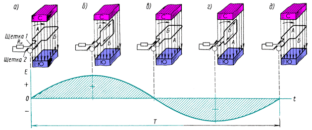 По мере поворота рамки э. д. с. и ток будут непрерывно увеличиваться до максимальных значений при вертикальном положении рамки (рис. 152, б) и вновь примут нулевые значения при угле поворота рамки 180° от первоначального положения (рис. 152, в). Во внешней цепи в этот полупериод ток проходил от щетки 2 к щетке /. При дальнейшем повороте рамки направление индуктируемой э. д. с. в каждой ее рабочей стороне меняется на обратное (рис. 152, г), и ток во внешней цепи во втором полупериоде проходит уже от щетки 1 к щетке 2, т. е. в обратном направлении. После прохождения горизонтального положения (рис. 152, д) цикл изменения э. д. с. и тока полностью повторится. Изменение э. д. с. и тока во внешней цепи иллюстрируется графиком, представленным на рис. 152. Если в первом полупериоде считать значения э. д. с. и тока положительными, то во втором полупериоде они