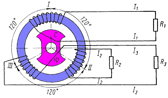 На практике наиболее широкое применение получил трехфазный электрический ток. Трехфазные генераторы имеют три самостоятельные обмотки I -III, расположенные по окружности одна относительно другой под углом 120° (рис. 153).