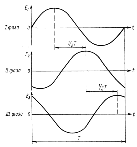 При вращении ротора, являющегося электромагнитом, в обмотках индуктируются переменные э. д. с. (рис. 154), сдвинутые по фазе (во времени) на 1/3 периода. Каждую из обмоток трехфазного генератора можно рассматривать в качестве однофазного генератора, питающего переменным током I1 – I3 свою внешнюю цепь с резисторами R1—R3 (см. рис. 153). Обмотка вместе с внешней цепью получила название фазы (От греческого слова phasis — появление).