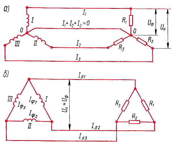 Напряжение Uд между линейными проводами принято называть линейным напряжением, а напряжение на каждой фазе Uф — фазовым напряжением. Токи в каждой фазе одновременно являются и линейными токами.