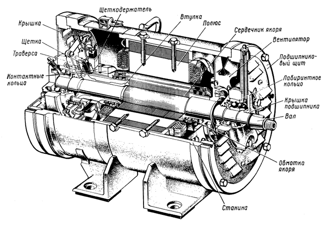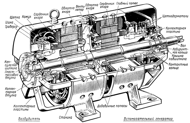 На главных полюсах расположены параллельная и последовательная обмотки возбуждения. Последовательная обмотка помогает поддерживать постоянным напряжение вспомогательного генератора, облегчая условия работы регулятора напряжения.