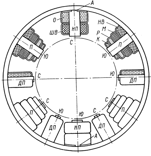 А - магнитный мостик; НП - главные насыщенные полюсы; П - главные ненасыщенные полюсы; ДП - добавочные полюсы; ШВ - параллельная обмотка; О - дифференциальная обмотка; НВ - обмотка независимого возбуждения; М - ограничительная обмотка; Р- регулировочная обмотка; К - последовательная обмотка