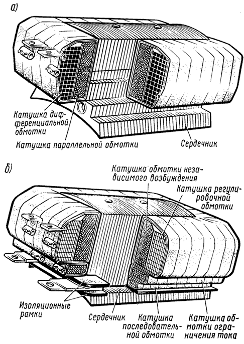 На каждом главном полюсе установлено по две катушки возбуждения. Одна катушка охватывает обе части полюса. Эти катушки всех главных полюсов возбудителя питаются током от вспомогательного генератора и образуют обмотку независимого возбуждения. Напряжение вспомогательного генератора поддерживается строго постоянным, поэтому этот ток возбуждения сохраняется неизменным. В независимую обмотку также поступает небольшой силы ток и непосредственно от выводов возбудителя. Вторая катушка охватывает лишь часть главного полюса. Эти катушки всех полюсов образуют дифференциальную (встречную) обмотку возбудителя. Дифференциальная обмотка включена в силовую цепь, по ней протекает весь ток генератора.
