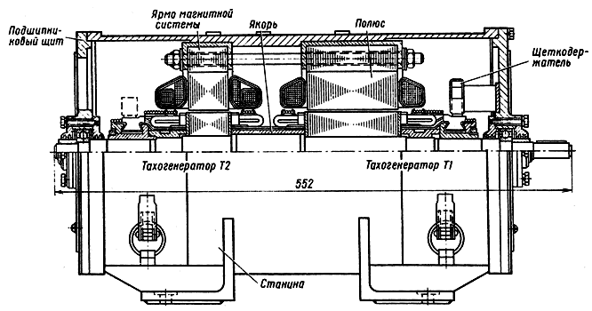 Каждая система состоит из ярма, сердечников, полюсов и обмоток. Корпус тахоагрегата отделен от магнитных систем слоем алюминиевого сплава и является экраном, который предупреждает проникновение магнитных потоков, создаваемых другими электрическими машинами и проводами при прохождении по ним тока, внутрь тахометрического агрегата. Поэтому внешние магнитные поля не влияют на характеристики тахогенераторов.