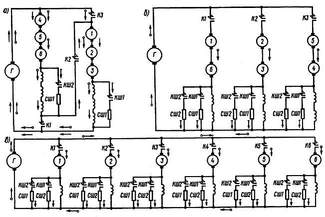 а - ТЭМ1 при последовательном и последовательно-параллельном соединении двигателей (см. стрелки); б - ТЭ3; в - 2ТЭ10Л, 2ТЭ10В