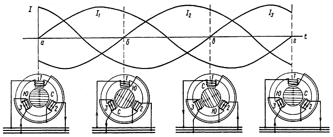 Рис. 178. Схема получения вращающегося магнитного поля в трехфазном электродвигателе