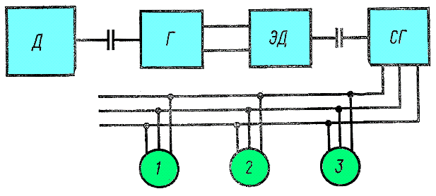 В этом случае дизель-генератор Д тепловоза работает с постоянной частотой вращения. Генератор Г вырабатывает постоянный ток, который приводит в действие электрический двигатель ЭД дополнительной двигатель-генераторной установки. Тяговый синхронный генератор СГ переменного тока этой установки вырабатывает электрическую энергию для питания тяговых электродвигателей 1 — 3. Регулируя частоту вращения двигателя дополнительной установки можно изменять частоту вырабатываемого тяговым генератором тока в необходимых пределах для обеспечения полного использования мощности дизеля при изменении скорости движения локомотива и частоты вращения якорей тяговых двигателей. Однако легко видеть, что в этом случае на тепловозе потребуется установить дополнительную двигатель-генераторную установку, имеющую большую массу, трудоемкую в ремонте, и применить специальную систему ее автоматического регулирования. Поэтому разработанные проекты тепловозов с такой системой регулирования частоты переменного тока, используемого для асинхронных тяговых двигателей, не были практически реализованы.