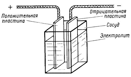 Простейший электрический аккумулятор состоит из пластин, опущенных в электролит, находящийся в сосуде (рис. 182).