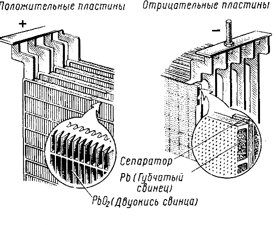 Различают положительные и отрицательные пластины аккумулятора. Положительные пластины соединяются при заряде с плюсовым выводом источника тока, отрицательные — с минусовым выводом. При прохождении тока через пластины и электролит происходят химические процессы, в результате которых изменяется химический состав пластин и электролита. Если после этого замкнуть выводы аккумулятора на внешнюю цепь, то в электролите и пластинах начнутся обратные химические процессы. Химические составы пластин и электролита возвращаются к первоначальному состоянию, но при этом в цепи проходит электрический ток. Процессы заряда и разряда аккумуляторов можно повторять много раз.
