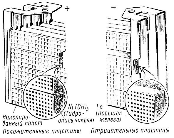 Пластины аккумулятора изготовлены в виде пакетов из тонкой никелированной стали и заполнены активной массой. Стенки пакетов имеют большое количество отверстий (перфорированные) для лучшего соприкосновения активной массы с электролитом. Как и в кислотных аккумуляторах, отрицательные пластины вставлены между положительными и отделены одна от другой сепараторами. В зависимости от состава активной массы отрицательных пластин щелочные аккумуляторы разделяют на два типа: железоникелевые и кадмиево-никелевые.