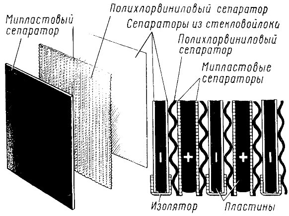 Здесь, как и во многих других областях техники, на помощь пришла химия. Были созданы синтетические аккумуляторные сепараторы —полихлорвиниловые, стекловойлочные и ряд других. Для получения необходимой пористости в полихлорвиниловых сепараторах делается большое количество мелких отверстий. Поэтому такие сепараторы называют перфорированными. Полихлорвиниловые сепараторы могут быть микропористыми (поровинил). Хорошим материалом для сепараторов служит стекловойлок, состоящий из тончайших нитей стекла. Стекловойлок обладает наибольшей пористостью и химически инертен. Однако механическая стойкость стекловойлока мала. Сепараторы из стекловойлока успешно применяются в комбинации с сепараторами из других материалов, имеющих большую механическую прочность.