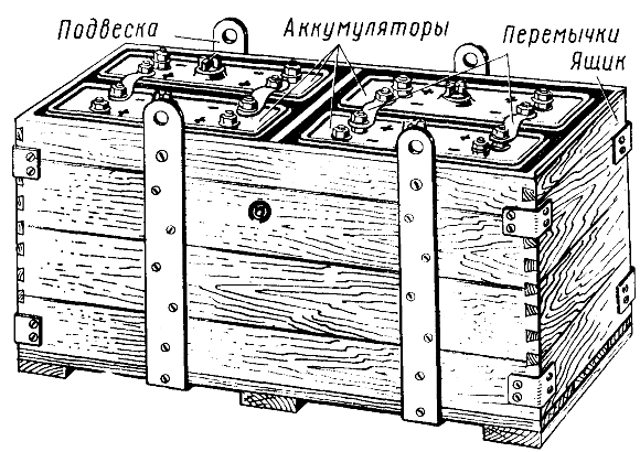 Баки для тепловозных аккумуляторов изготавливаются из эбонита. Они обладают достаточной механической прочностью и хорошими электроизолирующими качествами, не разъедаются, весьма легки, дешевы. На дне бака имеются ребра, на которые ставят пластины аккумулятора (см. рис. 185). Бак закрывается эбонитовой крышкой. Места соединения крышки с сосудом тщательно уплотняются асбестовым шнуром и кислотоупорной мастикой. Отверстия для прохода через крышку штырей полублоков пластин уплотняются резиновыми кольцами. В крышке имеется также заливочное отверстие, закрываемое специальной пробкой с внутренними каналами, предназначенными для выпуска газов, образующихся в аккумуляторе. Аккумуляторы по четыре монтируют в деревянных ящиках, окрашенных кислотоупорным лаком. Для удобства транспортировки ящики снабжены подвесками (рис. 187). На тепловозе ТЭЗ аккумуляторная батарея размещается вдоль дизель-генераторной установки под полом.